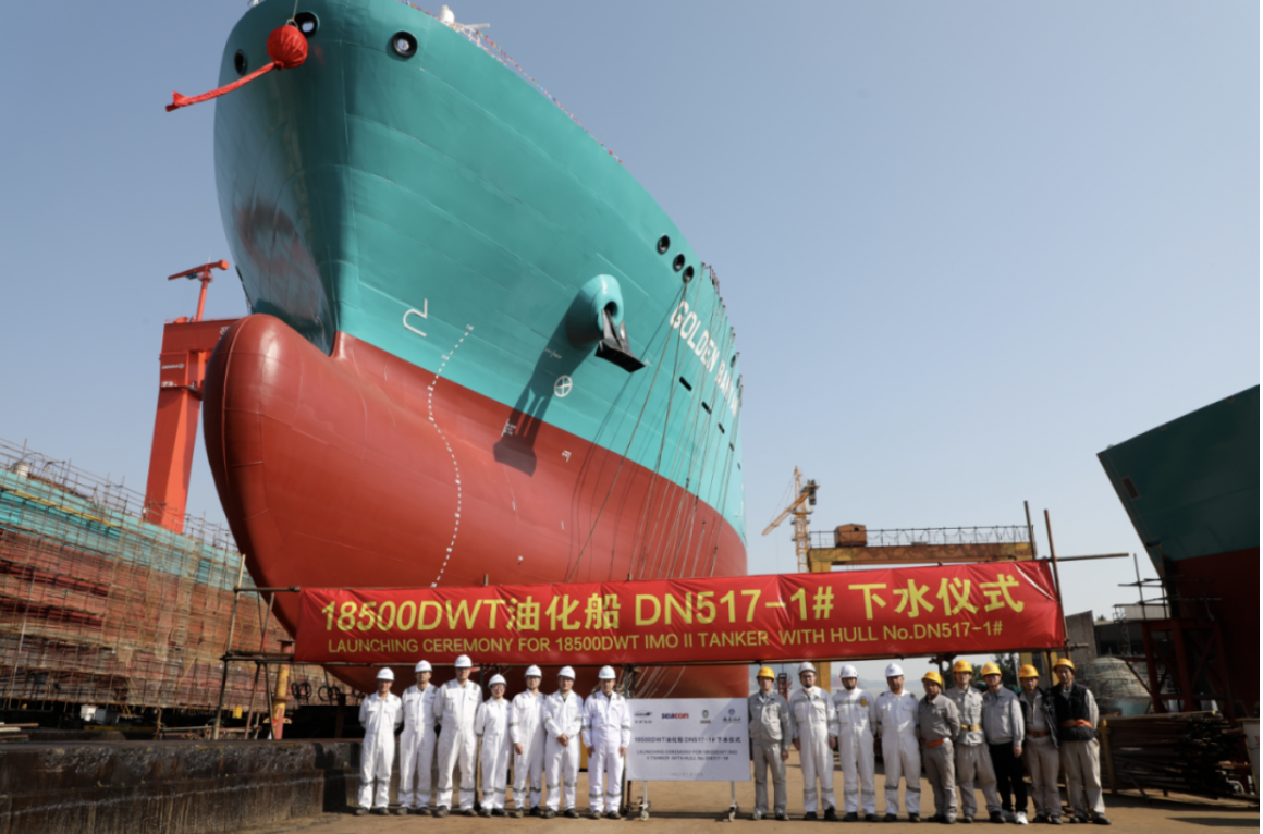 1月19日,由福建船政旗下東南造船廠建造的18500載重噸油化船(DN517-1)順利下水。該輪是洲際船務自營船隊第一艘新造化學品船。該型船總長149.8米,型寬22.8米,型深12.7米,設計吃水8.5米,主要用于運輸滿足IBC規范要求的試裝閃點≤60℃的成品油、植物油和散裝化學品(II類和III類),具有淺吃水、大艙容的特點,滿足無限航區要求。該船采用甲醇雙燃料預留設計理念,滿足IMO Tier III排放標準,未來可改造升級使用清潔能源甲醇燃料運行。
