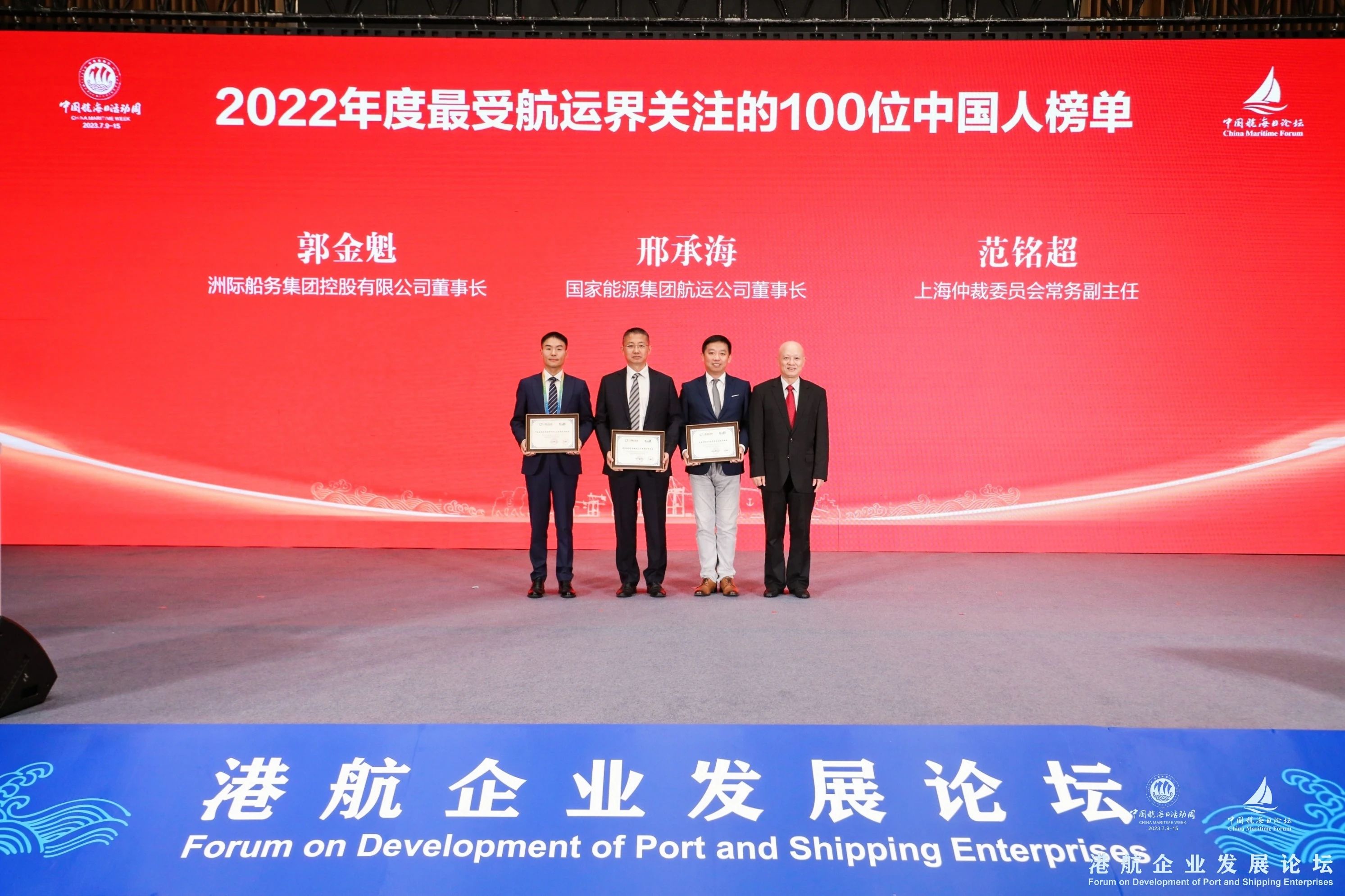 在嘉賓對話環(huán)節(jié),來自海事、港航、船檢、仲裁、通信等不同領域的專家就“優(yōu)化營商環(huán)境,服務港航經(jīng)濟”“能源物流供應鏈高質量發(fā)展”兩個話題展開交流對話和思想碰撞。論壇上,還舉行了2022年度最受航運界關注的100位中國人榜單頒獎儀式。集團董事長郭金魁先生連續(xù)第7年入選“最受航運界關注的100位中國人”榜單。