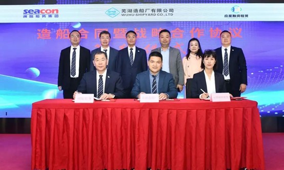 洲際船務(wù)及蕪湖造船廠就新造船合同進(jìn)行了簽約,并隨后簽署三方戰(zhàn)略合作協(xié)議。蕪湖造船廠有限公司董事長(zhǎng)張釗、洲際船務(wù)集團(tuán)控股有限公司董事長(zhǎng)郭金魁、應(yīng)星融資租賃(安徽)有限公司總經(jīng)理朱琦等出席簽約儀式。
