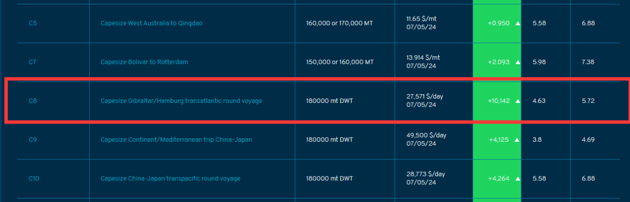此外,如上表,另外一條占據(jù)權(quán)重達(dá)到25%的太平洋市場的C10航線評估的等效期租租金也出現(xiàn)了不小幅度的上漲。周二評估的4264美元/天的上漲量(至28773美元/天)也相對于上周上漲了37%。