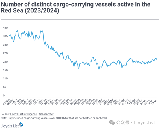 胡塞的進一步威脅并沒有影響紅海的通行。上周,每天平均有243艘船只穿越紅海,這是自2月以來的最高水平。