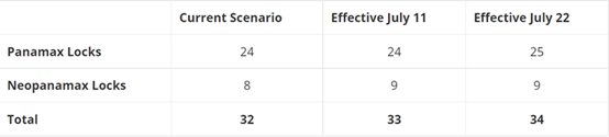 具體而言,自7月11日起,新巴拿馬型船閘將從8艘增至9艘次,從而使每日通過船舶總數達到33艘次。自7月22日起,巴拿馬型船閘的每日通過船舶數從24艘次增至25艘次,從而使每日通過船舶總數達到34艘。