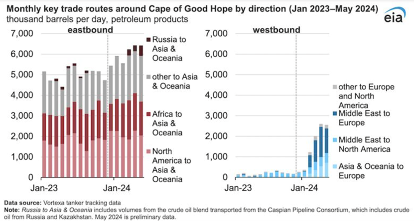 美國能源信息署的數(shù)據(jù)顯示,2024年前五個(gè)月,繞過好望角的原本平均每天590萬桶的原油和成品油運(yùn)輸量,已飆升至870萬桶,漲幅高達(dá)47%。