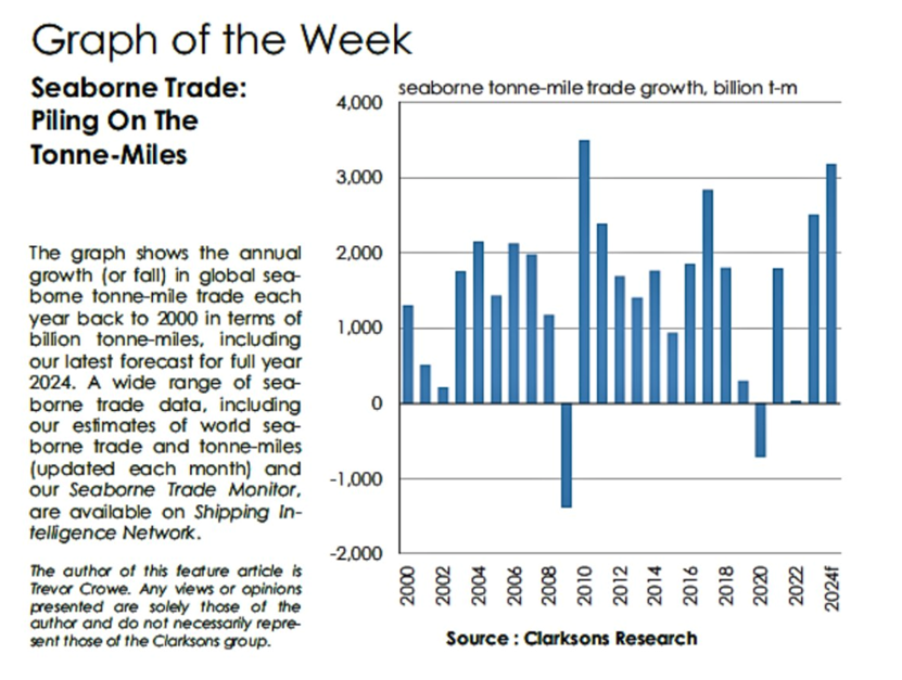根據全球最大船舶經紀商克拉克森的數據,受中東和歐洲地緣政治影響,以噸海里衡量的全球海運貿易量將創下有記錄以來第二大年度增幅。