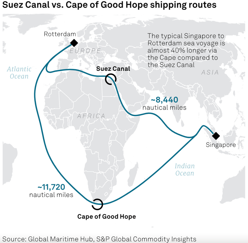 船舶改道好望角,最直觀的影響就是行距拉長。普氏數據顯示,以鹿特丹港至新加坡港為例,常規航程約為8440海里,繞道好望角約為11720海里,航程增加約40%,預計今年全球海上貿易平均航程將增加2.8%,而去年這一增幅僅為1.8%。