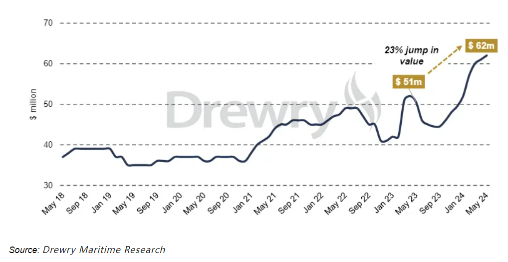 特別是五年船齡的海岬型船,自2023年8月以來,其價格持續(xù)上升,至2024年5月,同比上漲了23%,達(dá)到了6200萬美元的歷史最高點。