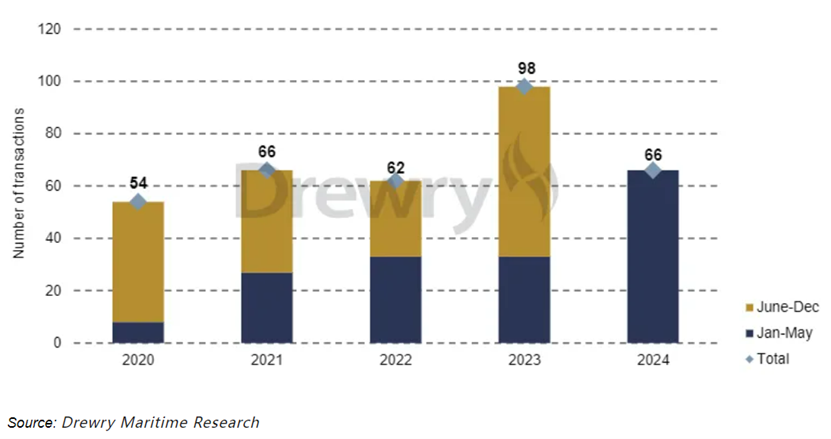 今年以來,干散貨航運(yùn)市場持續(xù)受到投資者的熱捧,尤其是海岬型船的交易市場異?;钴S。自2023年末以來,二手海岬型船的交易量顯著增加。2024年的前五個月,交易量同比增長了一倍,超過了2020年至2022年全年的交易總額。