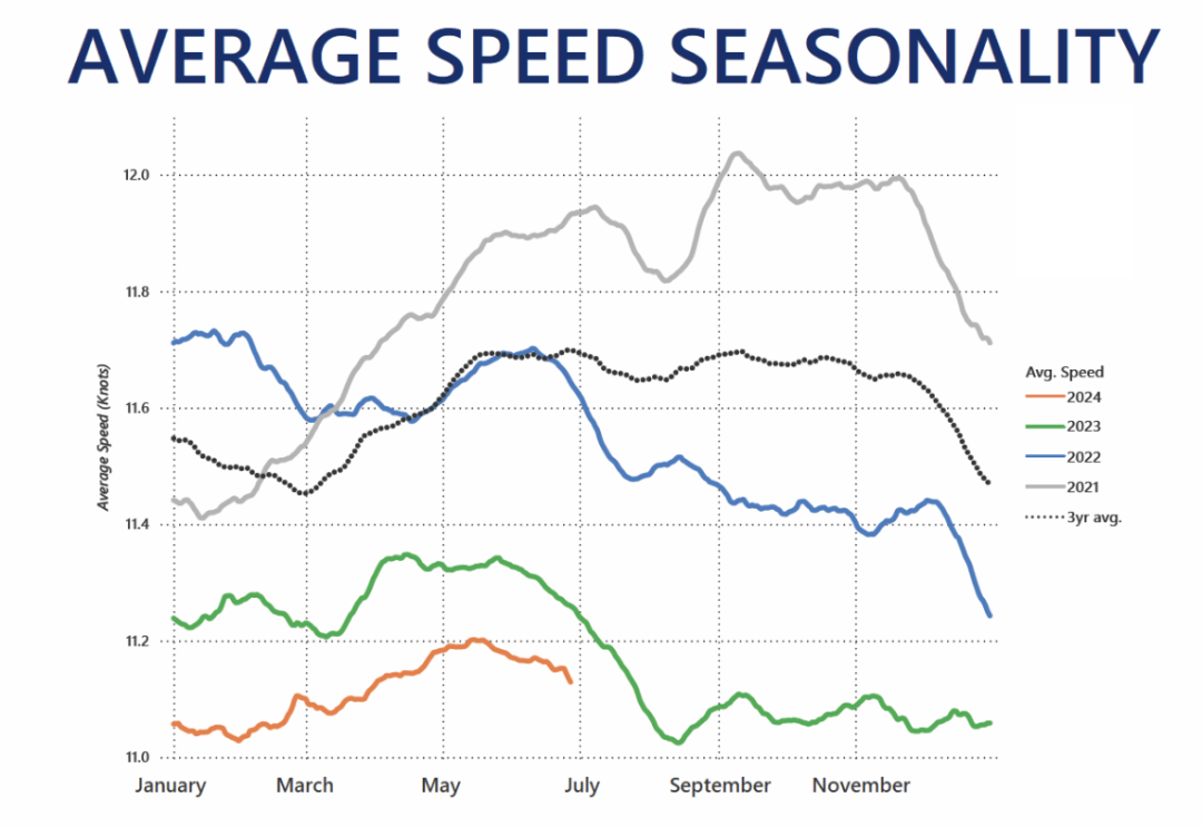 航運數據服務提供商AXS Marine在上個月的《散貨船船隊增長:十年回顧與 2025 年展望》報告中表示,全球散貨船隊的平均速度已連續連續四年持續下降。到目前為止,2024 年是過去 4 年中所有規模、滿載和壓載航行速度最低的一年。