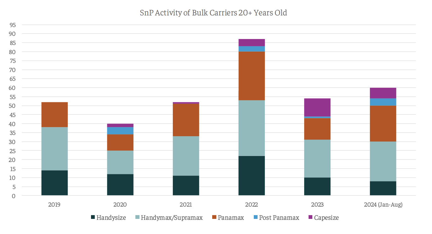 這一日益擴大的價格差異反映出市場趨勢。根據Intermodal最新報告,2024年上半年涉及船齡20年以上散貨船的交易數量達到歷史第二高。從1月至8月,60艘老舊船舶易主,其中中國航運公司在這類船舶的交易中尤為活躍,已確認購買了37艘。與此同時,希臘船東則在賣方市場上表現搶眼,已出售了19艘船舶。