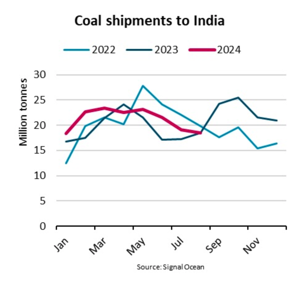 2024年1月至8月期間,印度煤炭進口量同比增10%,增速超過了本國煤炭開采量的8%。在強勁電力需求以及政府煤炭進口政策的推動下,動力煤的進口成為關鍵驅動力。然而,BIMCO航運分析師Filipe Gouveia表示:“隨著需求降溫,2024年剩余時間里這一增長可能放緩。”