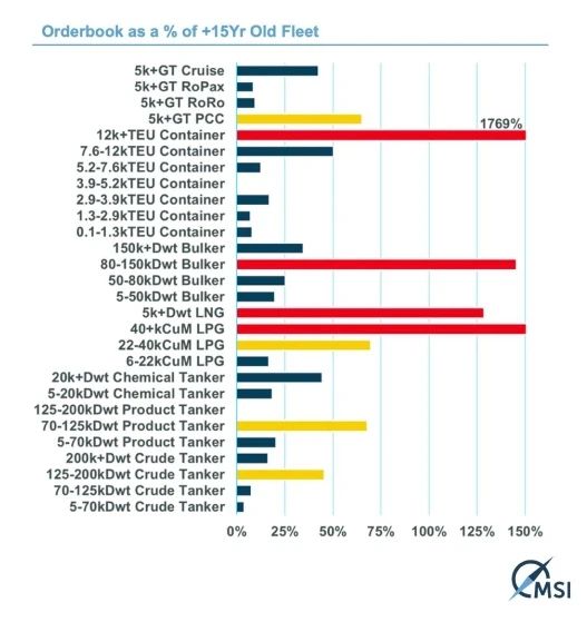 展望未來幾年,多個老齡化嚴重的航運板塊將面臨一個顯而易見的瓶頸:這些行業亟需更新船隊,但亞洲船廠卻已滿載著集裝箱船和氣體運輸船的訂單,導致新造船的資源十分有限。這種供需失衡的現象預示著,船東和運營商將面臨更嚴峻的抉擇。