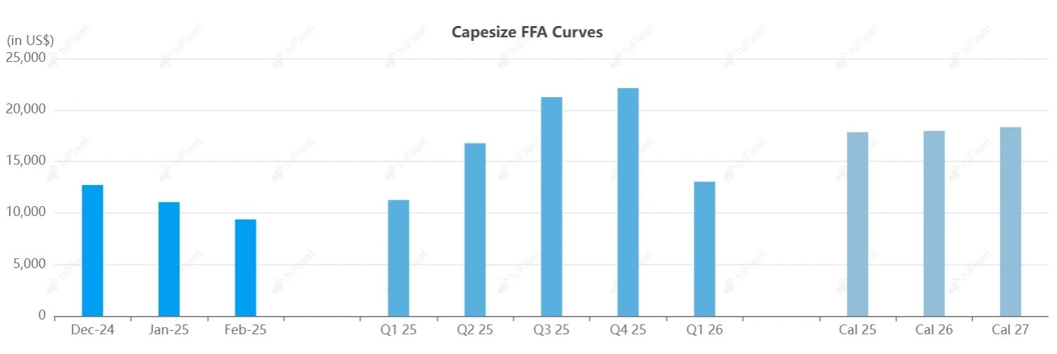 基于波羅的海交易所對海岬型型船 C5TC平均現(xiàn)貨運費評估的1月遠期運費協(xié)議(FFA)在周一下跌了4.4%,跌至11,050美元/填。而2月的合約跌幅更大,下降5.3%,降至每日9,375美元。期貨曲線的最低點出現(xiàn)在2月,而市場普遍預(yù)計3月會有一定程度的反彈。