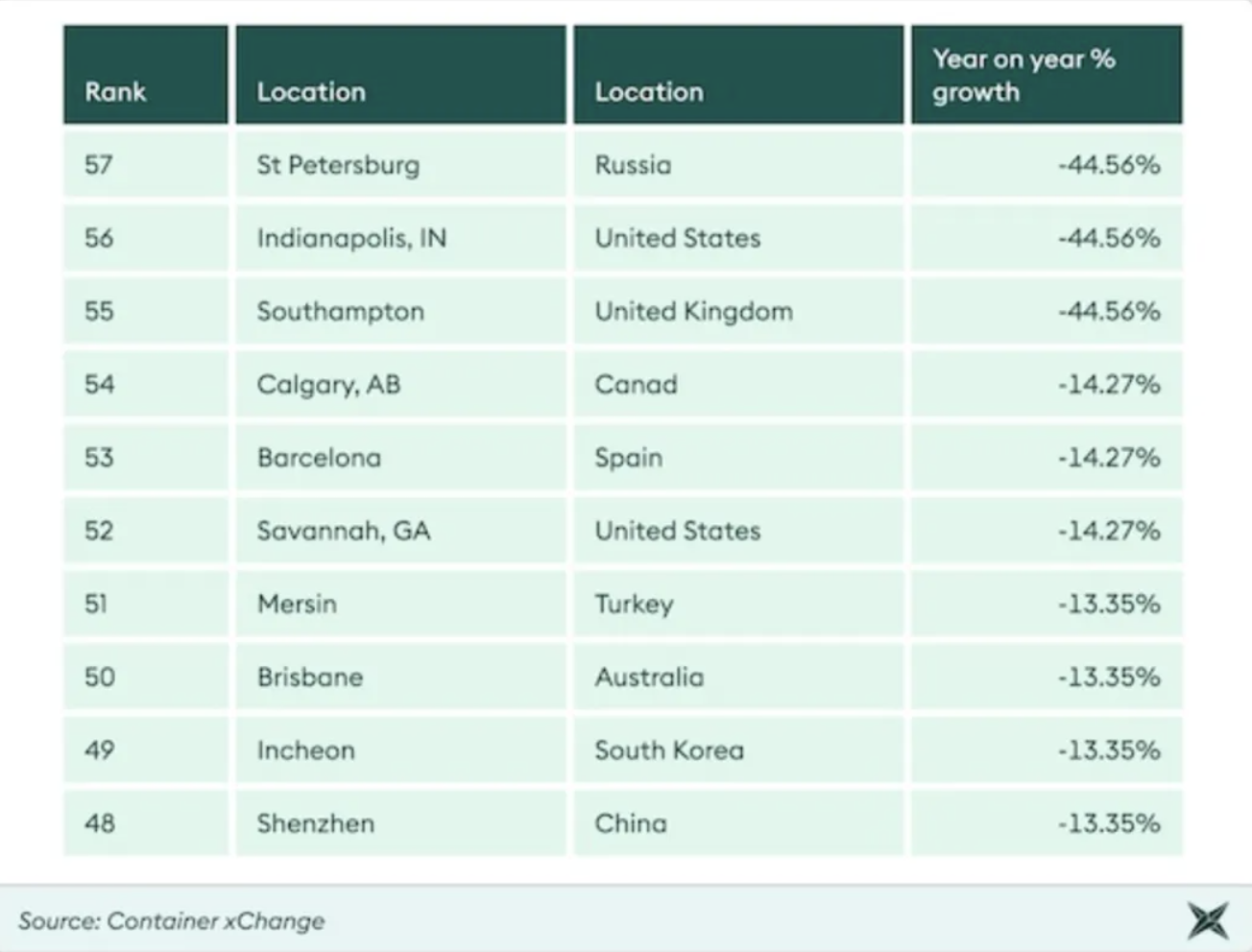 反之,如下地區(qū)的集裝箱價(jià)格跌幅最深,歸因于供過于求、需求萎縮或其他經(jīng)濟(jì)壓力。