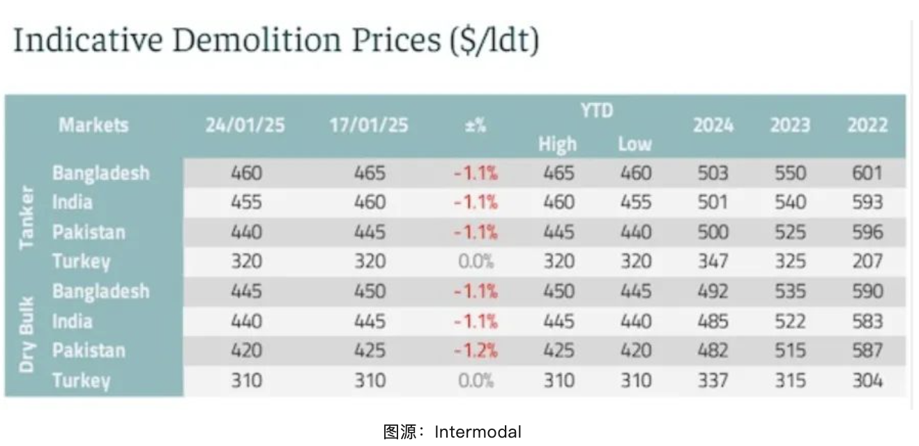 航運(yùn)界網(wǎng)消息,今年以來(lái),全球拆船市場(chǎng)延續(xù)了2024年的整體趨勢(shì),繼續(xù)面臨壓力。船舶現(xiàn)金買家Best Oasis在其周報(bào)中指出,“全球拆船市場(chǎng)持續(xù)低迷,需求疲軟,所有主要目的地的價(jià)格都在下跌”。