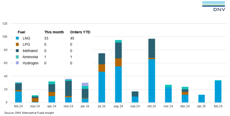今年前兩個(gè)月,替代燃料船舶的訂購數(shù)量達(dá)到了45艘,與去年同比下降了35%,這一減少主要?dú)w因于1月較低的訂單量(包括傳統(tǒng)燃料船舶)。不過,今年2月的訂單數(shù)是自去年10月以來達(dá)到的最高水平。
