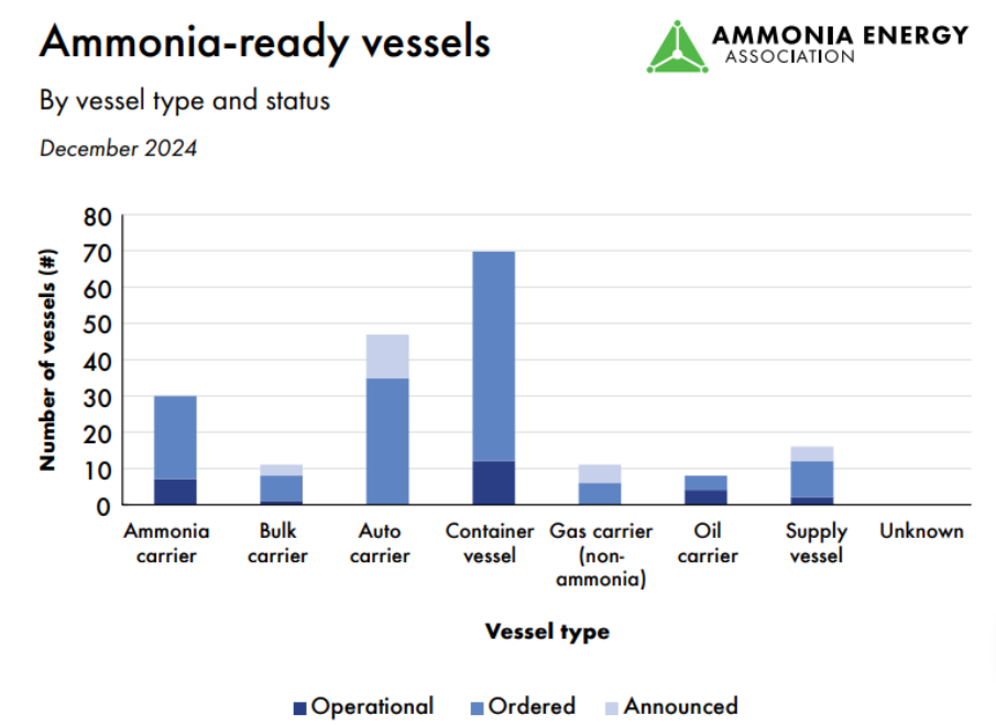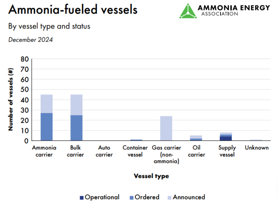 而第一艘氨燃料就緒(ammonia ready)的船舶于2022年初下水。截至2024 年12月,已有26艘氨燃料就緒船舶投入運營。