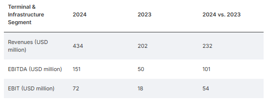 2025年,赫伯羅特的碼頭基礎設施部門完成了第一個完整運營年,報告的收入為4.34億美元,同比增長215%,得益于良好的運量發展和自2023年8月以來公司對智利SAAM Ports & Logistics的全面整合。由于上一財年的幾項收購,EBITDA和EBIT激增:息稅折舊及攤銷前利潤(EBITDA)達1.51億美元,同比大增300%;息稅前利潤(EBIT)達7200萬美元,同比暴漲400%。