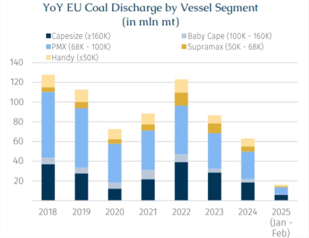 煤炭主要采用海岬型與巴拿馬型船運輸,根據BRS提供的數據,2024年海岬型船市場向歐洲輸送煤炭的需求下降幅度最大,從2022年的320萬噸下降53%至1840萬噸。與此同時,2024年巴拿馬型船的出貨量大幅下降44%至2780萬噸;所有船型均觀察到下降,但幅度各不相同,與歐盟煤炭進口的整體下降相一致。