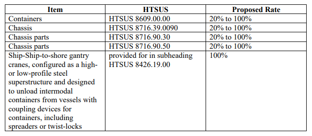 對中國制造或含中國組件的起重機,計劃加征100%關稅。對中國制造的集裝箱、底盤及相關零部件,計劃加征20%-100%關稅。該擬議關稅還將征求公眾意見。