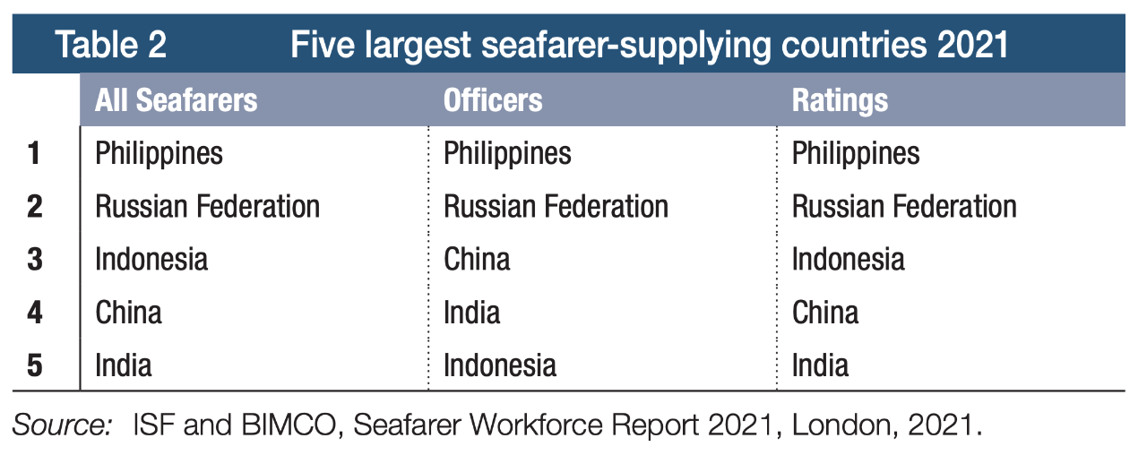 全球船員勞動(dòng)輸出國前五名為菲律賓、俄羅斯、印尼、中國、印度
