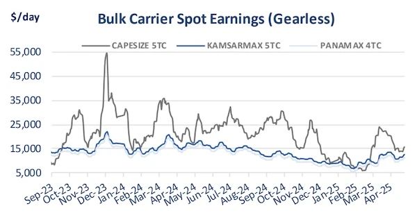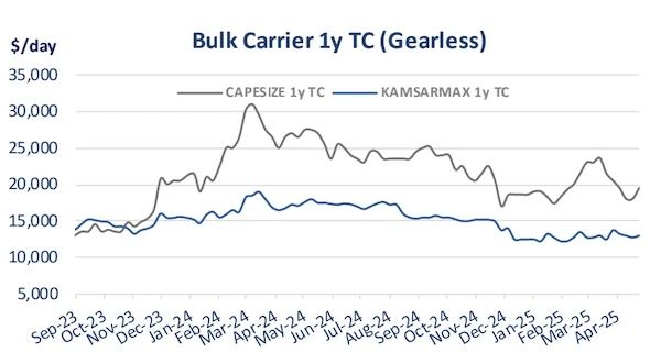 “至于巴拿馬型船舶,盡管波動性略低,依舊在春季表現出一定的下行趨勢,尤其是2023年,由于南美谷物出口疲軟及貿易政策不確定性加劇,4至5月的平均租金偏低。到了2025年春季,市場雖出現部分回升,但仍未恢復至年度平均水平。整體來看,該船型在春季更容易受到地區性農產品運輸和大西洋需求波動的影響。”