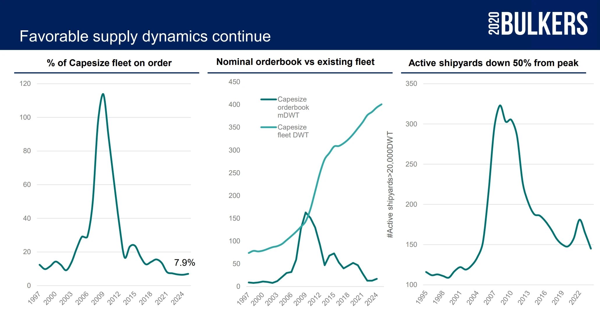 Svensen強調,航運周期往往不是因為需求端出了問題,而是供應過剩才導致市場失衡。“從目前來看,未來三到四年船舶供應情況基本可控。現階段,海岬型新船訂單量僅相當于現有船隊的7.9%,創下歷史新低。與此同時,全球活躍船廠的產能仍比2008年高峰期低50%,短期內幾乎不可能出現大規模的新船交付潮,市場供需格局因此具有較強韌性。”