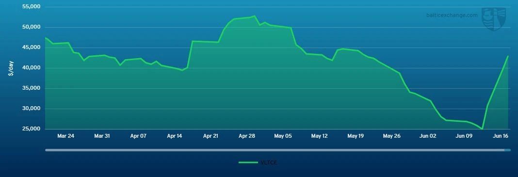 6月17日:達(dá)到43,093美元/天(增長3,203美元)。這意味著在短短四個工作日內(nèi),累計(jì)漲幅接近72%,顯示出地緣政治緊張(如中東局勢升級)可能正推動市場預(yù)期升溫,油輪運(yùn)力需求顯著增強(qiáng)。