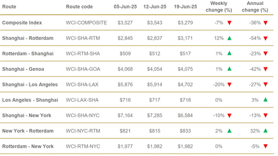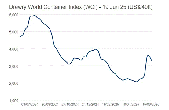 與此同時(shí),截至6月19日,Drewry世界集裝箱運(yùn)價(jià)指數(shù)(WCI)環(huán)比下跌7%,約3279美元/FEU。