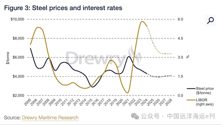 盡管鋼材價格自2021年高點大幅下降,但新造船價格仍在2020年至2024年間飆升了約50%。這是因為頭部造船廠的產能利用率一直居高不下,由于訂單強勁,造船廠的議價能力得到了增強。雖然今年初以來新訂單持續(xù)疲軟已導致新造船價格有所回落,但目前新造船價格依然處于歷史高位。如果當前訂單停滯時間進一步延長,將影響造船廠的產能利用率,新造船價格將持續(xù)大幅下降。