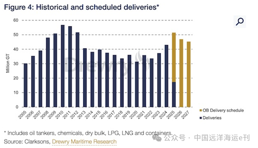 IMO的凈零框架(IMO NZF)增加了船東投資決策的復雜性,進一步抑制了新造船活動。預計新訂單在2025年10月之前將持續(xù)低迷。因為行業(yè)正等待即將召開的IMO會議帶來的明確信息。如果IMO凈零框架獲得通過,會帶來適度的訂單增長,但總體交易量預計到2027年才會回升至歷史平均水平。屆時IMO可能會出臺更明確的激勵措施,以鼓勵使用零或近零(ZNZ)排放燃料和技術的船舶。此外,市場對全球利率下降的預期也促使許多船東推遲投資決策,新訂單暫時擱置。