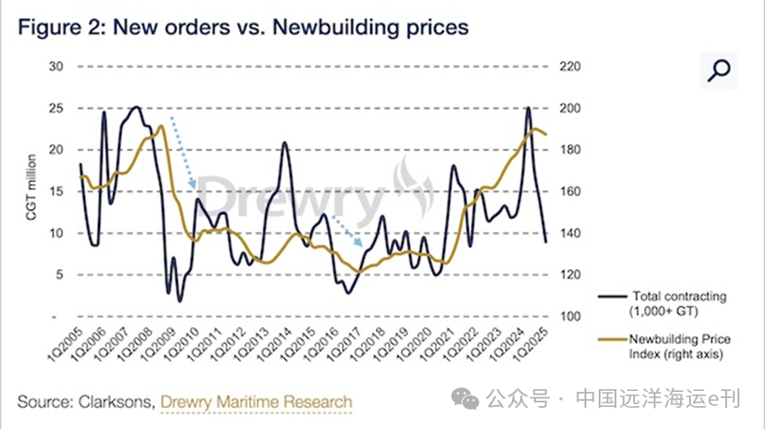 新造船價格在2025年初就已顯現(xiàn)疲軟跡象,預計這一下行趨勢將會持續(xù)。由于國際海事組織(IMO)法規(guī)的不確定性,新船訂單增長受抑,造船廠之間的競爭愈發(fā)激烈。