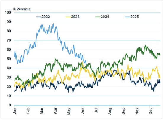 港口擁堵導(dǎo)致海岬型船舶(17萬+載重噸)在港口停留時(shí)間更長(zhǎng),從2024年的平均約13天上升到2025年3月和4月的17天和15天,導(dǎo)致市場(chǎng)供需平衡進(jìn)一步收緊。
