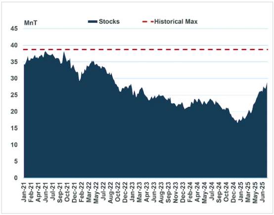 他補(bǔ)充稱,“持續(xù)的庫(kù)存增加可能會(huì)對(duì)貿(mào)易前景產(chǎn)生強(qiáng)烈影響;這很難量化,盡管數(shù)據(jù)顯示,再增加1200萬噸將突破歷史最高水平。”