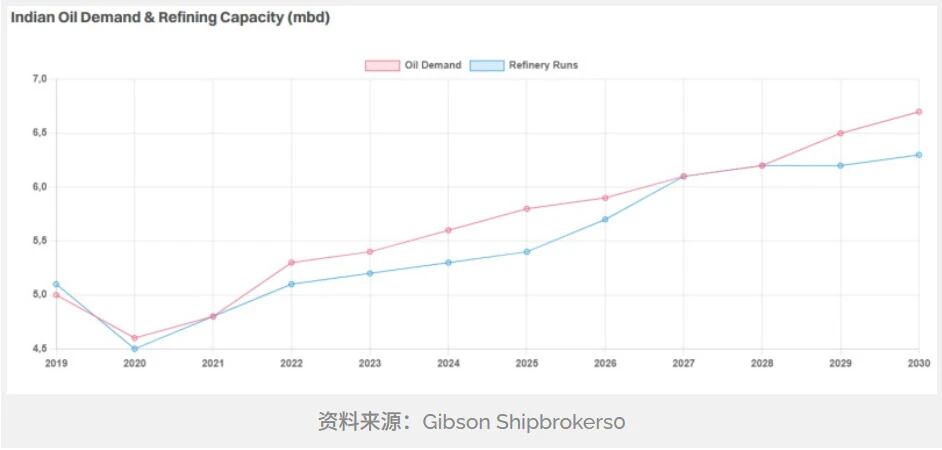 航運界網消息,船舶經紀公司Gibson在其最新報告中指出,印度日益增長的煉油產能與國內消費動態,可能在短期內為油輪市場,包括成品油輪和原油油輪,提供顯著支撐。
