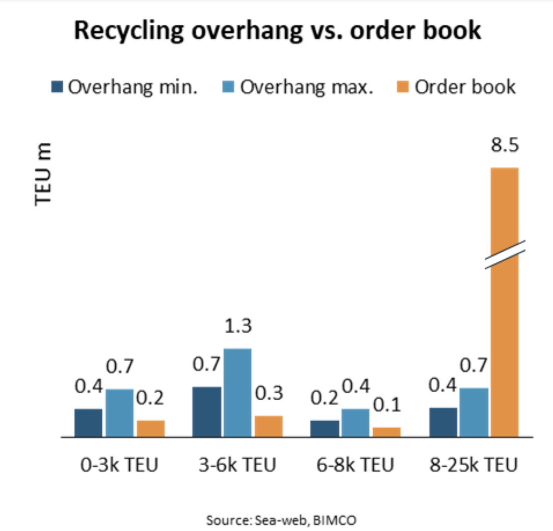Rasmussen表示,未來的拆解規(guī)模難以精確預(yù)測,但現(xiàn)有測算顯示,這一“潛在拆解潮”相當(dāng)于當(dāng)前營運(yùn)船隊(duì)的6%-10%,或相當(dāng)于20年以上老齡船的33%-55%。值得注意的是,這一潛在拆解量已超過所有小于8000TEU船型的在手訂單量,這意味著未來幾年全球船隊(duì)的增量或?qū)⑼耆纱笮痛爸鲗?dǎo),并可能引發(fā)更劇烈的“船型級聯(lián)效應(yīng)”,即大型船舶進(jìn)一步蠶食中小型船舶的航線市場。