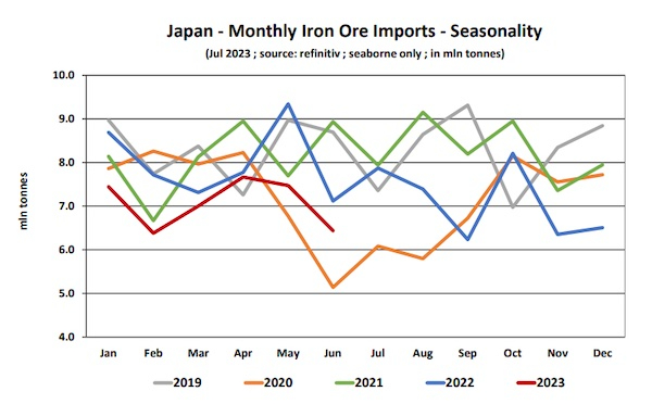 據船舶經紀人稱,“除了中國大陸,其他地方的需求都很低迷。2023年1-6月,中國鐵礦石進口量同比激增9.2%,至5.622億噸,創歷史新高。對歐盟而言,進口量同比下降18.1%至3480萬噸。日本鐵礦石進口量同比下降11.6%,至4240萬噸。韓國鐵礦石進口量同比下降12.5%,至3280萬噸。日本是世界第二大鐵礦石進口國,僅次于中國大陸,領先于歐盟和韓國。”