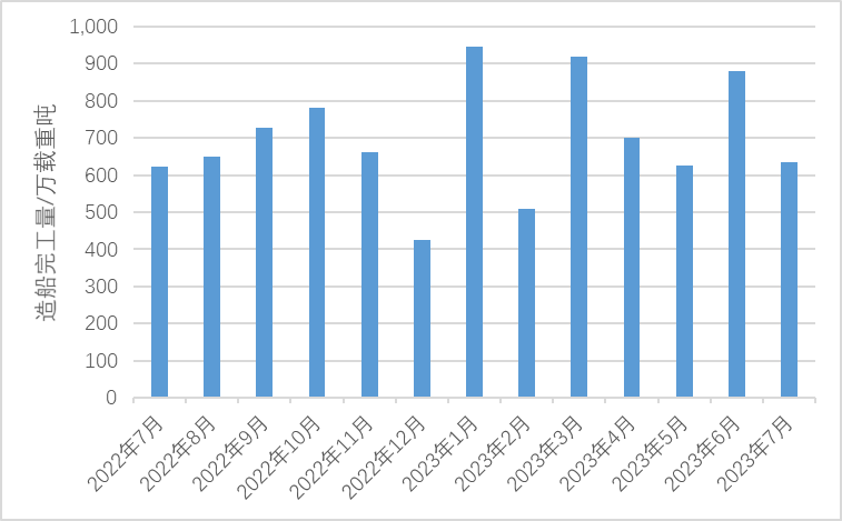 2023年7月,全球成交新船訂單100艘973萬載重噸,同比分別上升7.5%和109.2%,環比分別下降4.8%和上升20.3%。全球船舶完工交付96艘636萬載重噸,同比分別下降14.3%和上升2.3%。7月末,全球船舶手持訂單4121艘2.45億載重噸,同比分別下降7.0%和上漲1.7%。