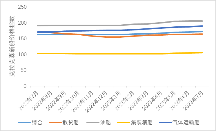 截至2023年7月,克拉克森新船價格指數收于172點,環比上漲0.8%,同比上漲6.4%。從主力船型看,散貨船、油船、集裝箱船和氣體運輸船的克拉克森新船價格指數分別為164點、206點、105點和190點;所有船型環比均上漲,漲幅分別為0.2%、0.3%、0.7%和1.2%;除散貨船有所下降外,其他船型同比均有所上漲,漲幅分別為7.8%、2.3%和10.8%。從典型船型看,17.4萬立方米LNG運輸船的新船價格仍在上漲,已達2.61億美元;2.3萬TEU箱船和VLCC新船價格保持穩定,分別為2.25億美元和1.26億美元。