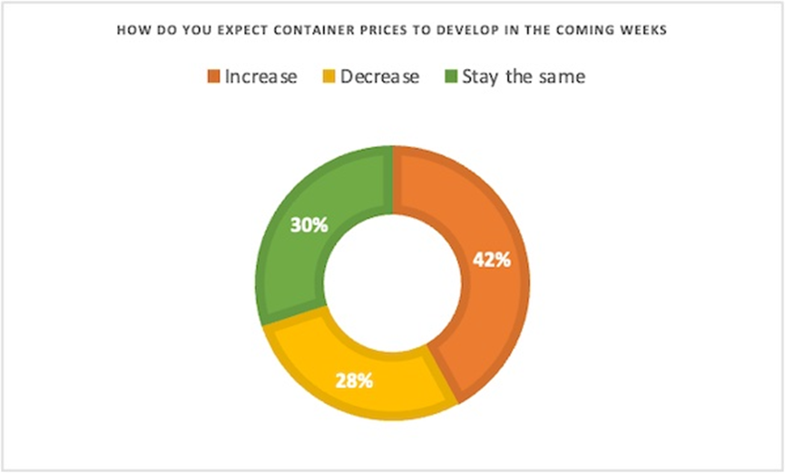 據悉,7月份接受調查的2570名供應鏈專業人士中,大多數受訪者(42%)預計集裝箱價格在短期內會上漲,這表明市場有可能改善,28%的受訪者預計集裝箱價格會進一步下跌,這表明對市場狀況有一定程度的悲觀情緒。30%的受訪者堅持認為價格將保持不變。