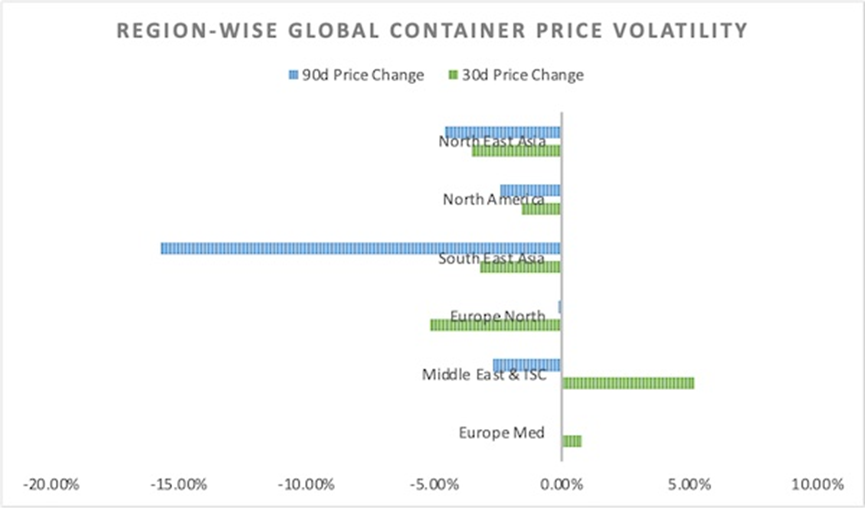 通過分析關鍵地區30天的價格變化,2023年7月的平均價格波動范圍從-4%到+5.20%。然而,東南亞地區集裝箱價格在90天內出現了明顯的下跌,從2023年5月到7月,集裝箱價格大幅下跌15.73%。