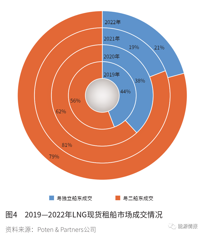 如前所述,2021—2022年市場上大量獨立船東的運力被LNG資源組合供應(yīng)商、貿(mào)易商、生產(chǎn)商以中短期期租的形式鎖定,導(dǎo)致LNG運輸市場的流動性大大降低,尤其是在市場運力緊張的時候,現(xiàn)貨船的租家面臨高租金甚至租不到船的風(fēng)險。根據(jù)Poten&Partners的統(tǒng)計數(shù)據(jù),2021—2022年現(xiàn)貨船租家直接與獨立船東成交的數(shù)量占成交總量的比例僅為20%左右,遠低于2020年38%和2019年44%的水平(見圖4)。由于2021—2022年現(xiàn)貨租船市場的即期運力多集中在二船東,即眾多資源組合供應(yīng)商和貿(mào)易商手中,租家有即期運力需求時只能尋求與二船東成交。即期運力供給不足、市場流動性變差,是導(dǎo)致2021—2022年冬季LNG市場運力緊缺時市場租金暴漲的主要原因。