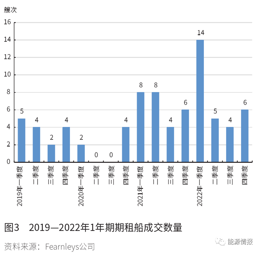 經(jīng)歷了2020年冬季運力短缺,為提前應(yīng)對可能出現(xiàn)的即期市場運力不足,并為了配合貿(mào)易運作,與前幾年相比,近兩年不少租家會選擇在淡季提前租入中短期期租運力,導(dǎo)致現(xiàn)貨租船市場上由獨立船東控制的運力大幅減少,使得四季度傳統(tǒng)旺季市場運力供不應(yīng)求時容易出現(xiàn)價格快速跳漲的現(xiàn)象。根據(jù)船舶經(jīng)紀(jì)公司Fearnleys的統(tǒng)計,2022年共有29艘次1年期左右的中短期期租船成交,2021年為26艘次,成交數(shù)量遠高于過去2年(見圖3)。