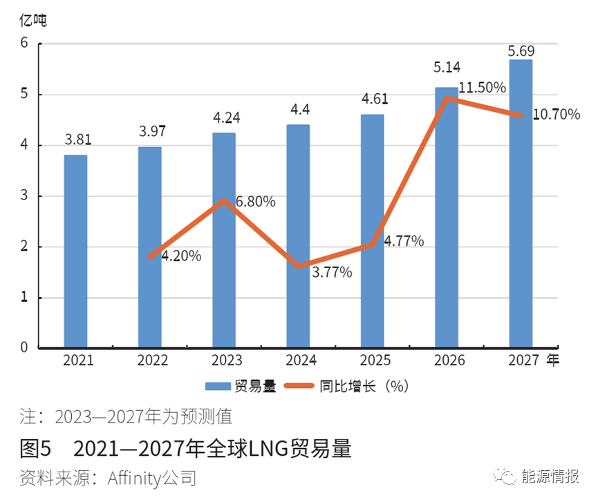 根據(jù)咨詢機構(gòu)Affinity的預(yù)測,2023年全球LNG貿(mào)易量將達到4.24億噸,較2022年的3.97億噸增長約6.8%,2027年將達到5.69億噸(見圖5)。此外,2030年約80%的新增LNG供應(yīng)量將來自卡塔爾和美國;2040年全球LNG需求量將達到每年6.5億~7億噸。預(yù)計未來5年(到2028年)內(nèi)總共需要新增300~400艘LNG船舶才能支撐期間LNG貿(mào)易量的增長。