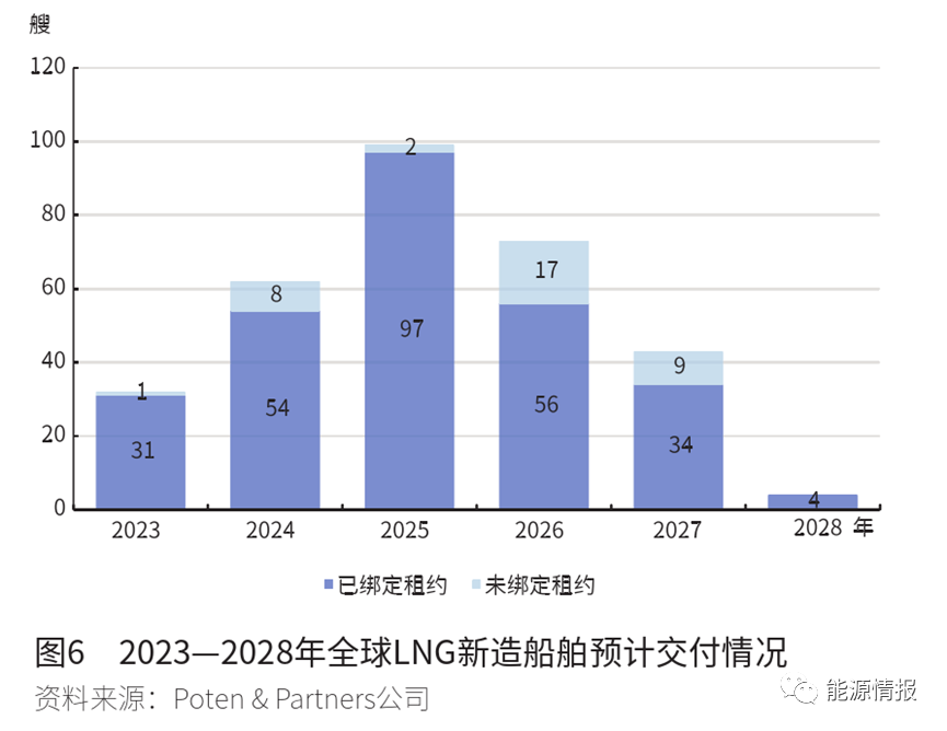 根據(jù)Poten&Partners的統(tǒng)計數(shù)據(jù),截至2023年5月底,全球共有約590艘艙容大于13萬立方米的大型LNG船舶在運營,不包含51艘浮式LNG儲存及再氣化裝置(FSRU)和LNG浮式儲存裝置(FSU);未來5年(到2028年)大型LNG新造船舶訂單共有313艘(不包含F(xiàn)SRU/FSU),其中絕大部分船舶都已經(jīng)綁定了租約,僅有37艘未獲得租約(見圖6)。
