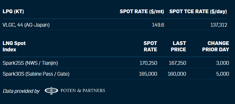 POTEN&PARTNER的昨天最新數據更是顯示,VLGC的中東-日本航線的即期等效期租租金超過了13.7萬美元/天,進一步逼近了歷史最高值。