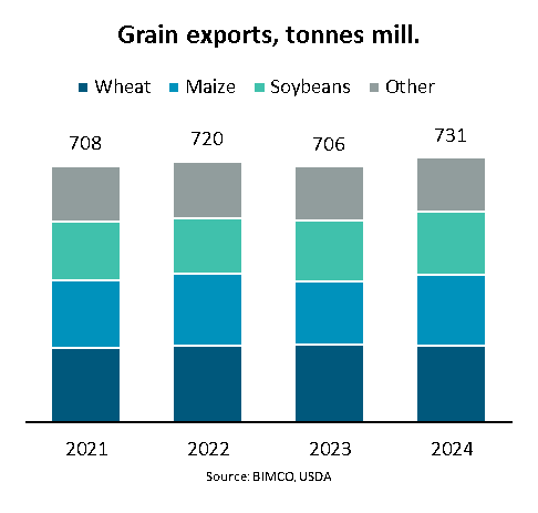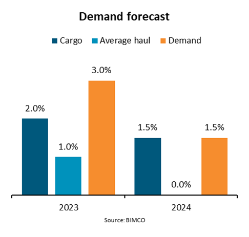 預計2023年剩余時間,即期運費可能略有上升。然而,運費可能不會反彈到2023年3月和4月的水平,尤其是在小型船市場。2024年的運費水平預計與2023年相當。預計鐵礦石出貨量增速將放緩,而煤炭出貨量也將下降。需求可能由谷物和小宗商品推動,并支撐較小船型市場。而隨著新船大量交付,大靈便型船的運費或?qū)⒊袎骸?/span>