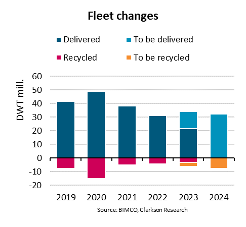 預計2023年拆船量達到610萬載重噸,2024年將達到750萬載重噸。今年至今,滿載和空載航行速度分別下降了2.5%和1.8%。