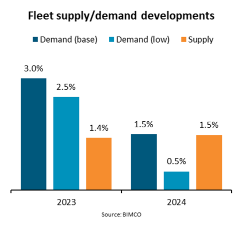綜上,預計2023年和2024年的干散貨船運力供應將增長1%~2%,而2023年需求增長為1.5%~2.5%,2024年增長1%~2%。在低情景下,供需關(guān)系趨向弱平衡,尤其是在2024年。