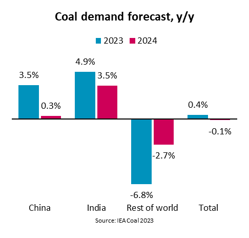 在基礎(chǔ)情景下,預計2023年煤炭出貨量將增長4%~5%,2024年將下降1%~3%。根據(jù)國際能源機構(gòu)的數(shù)據(jù),2023年全球煤炭需求可能增長0.4%,達到新的峰值,2024年下降0.1%。2024年,預計發(fā)達經(jīng)濟體煤炭需求的下降速度將快于中國、印度和東南亞的需求增速之和。