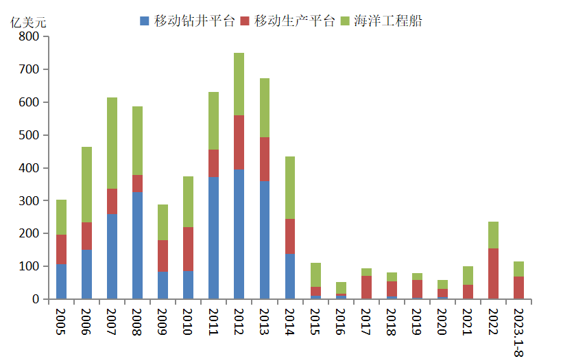盡管上游市場高度興旺,但是海工裝備建造市場仍受到多方面因素制約。一方面,從事主要海工裝備建造的船廠生產資源緊張,導致海工裝備新建價格大幅上漲,增加新裝備訂造成本;另一方面,“一朝被蛇咬,十年怕井繩”,船廠承接訂單十分謹慎,油價未來走勢也存在一定的不確定性,船東投資訂造也同樣謹慎。2023年1-8月,全球共成交各類海洋工程裝備80艘/座、144.5億美元,同比并未增長。但是隨著上游市場的持續活躍、供給面臨下行壓力、綠色環保法規的不斷施行,上游市場有望進一步走高,對海工裝備建造市場產生實質性的拉動。